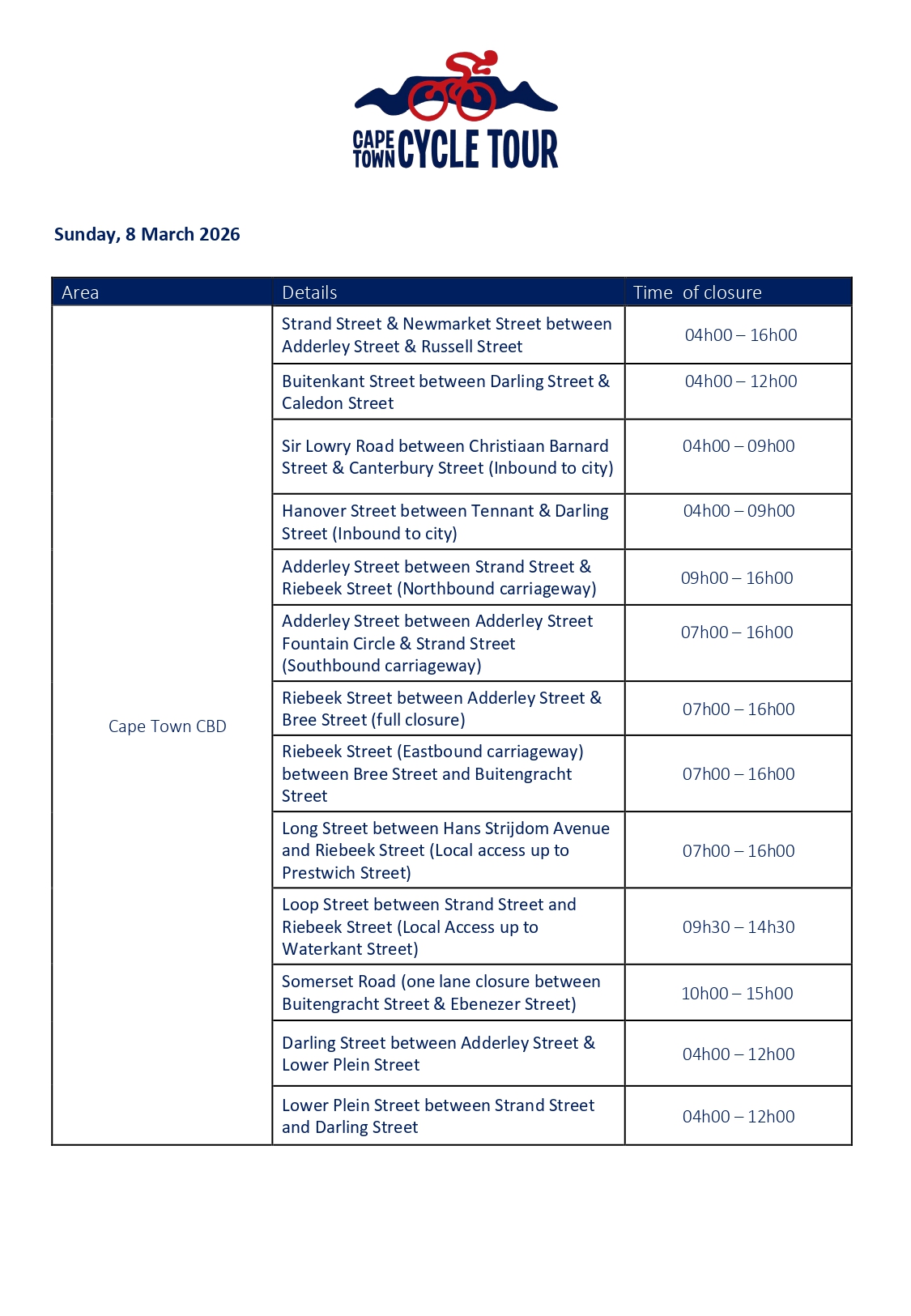 On account of the 42km and 109km races, many Cape City roads will probably be closed from Thursday, 5 March, till Sunday, 8 March 2026. This record is provisional and topic to alter.
