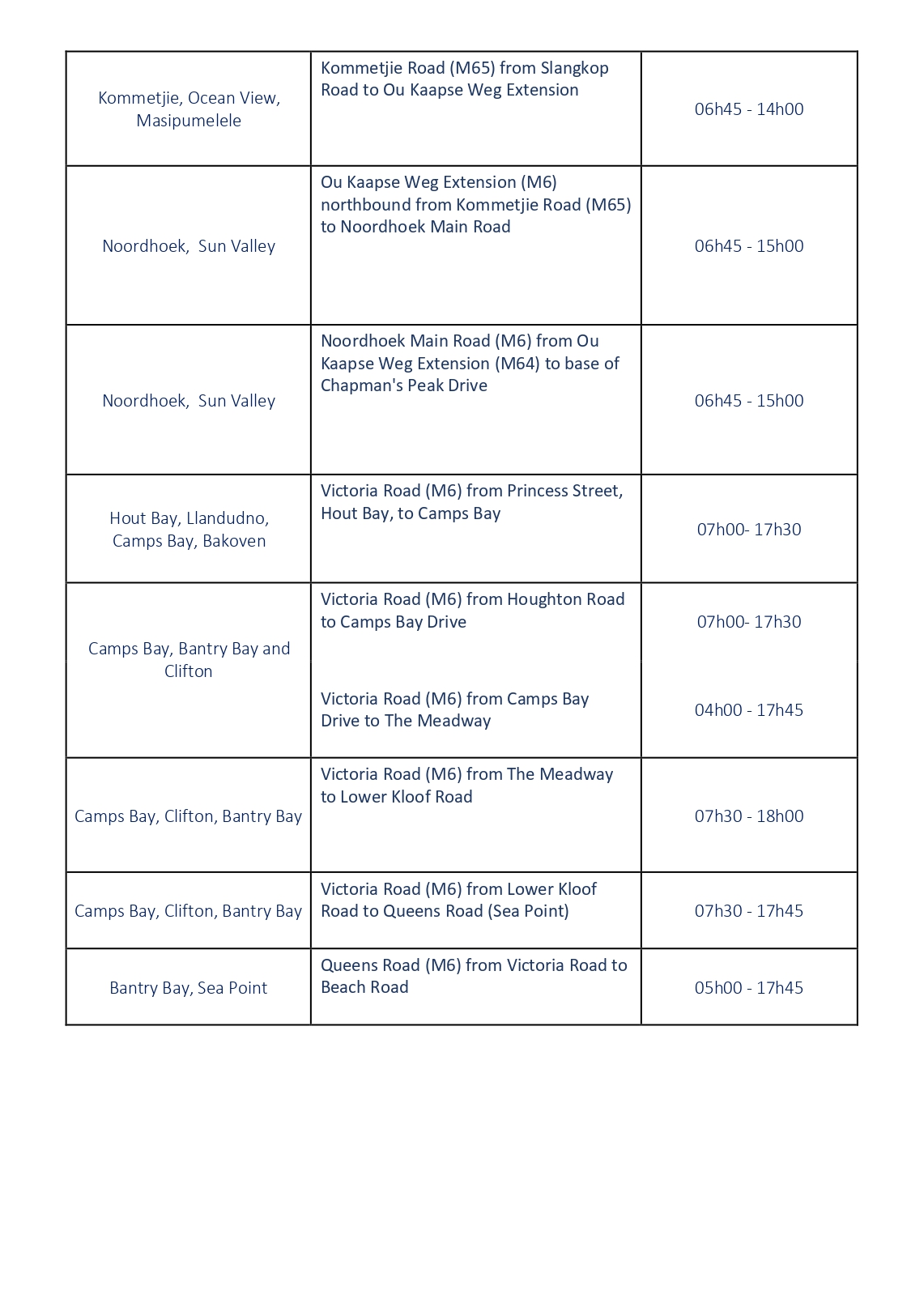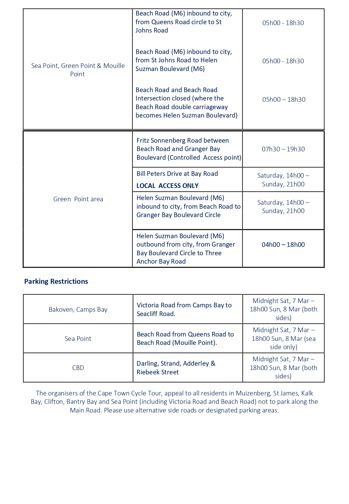 Residents in Muizenberg, St James, Kalk Bay, Clifton, Bantry Bay and Sea Level (together with Victoria Highway and Seashore Highway) are urged to not park alongside the Major Highway. Please use various facet roads or designated parking areas.
